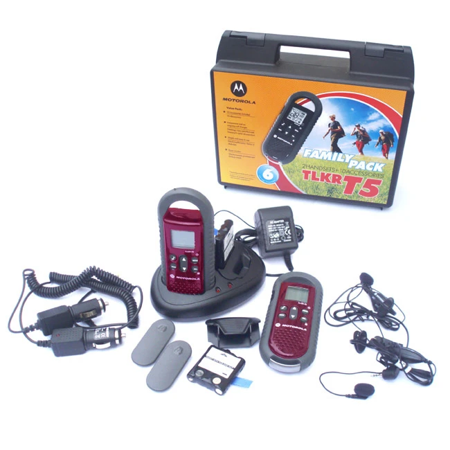 Radiostanice (vysílačky) Motorola TLKR T5 typ P14MAA03A1AP prodáváme v krabici, které obsahuje dvě vysílačky (radiostanice) Motorola TLKR T5 (jeden pár vysílaček v červeném provedení), dvě nabíjecí baterie 550 mAh NiMH, nabíječ pro dvě vysílačky (lze nabíjet i samostatné baterie), dva klipsy na zavěšení radiostanice na opasek a návod k obsluze. Výhodné balení Family Pack navíc obsahuje ještě dva CL adaptéry pro možnost napájení vysílaček Motorola TLKR T5 a T7 ve vozidle ze zásuvky zapalovače (12-24V). Dále Family pack Motorola TLKR T5 obsahuje dvě externí audio soupravy pro skryté nošení typ 00174 (ENTN8870) a tento celý set je dodáván v odolném černém plastovém kufříku.