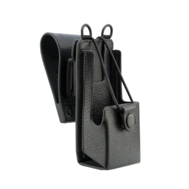 Pouzdro typ PMLN8435 pro profesionální vysílačky Motorola R2 vyrobené z odolné tvrdé kůže má na zadní straně  otočé opaskoé oko pro nasazení na opasek do šíře 3" (7,6 cm).